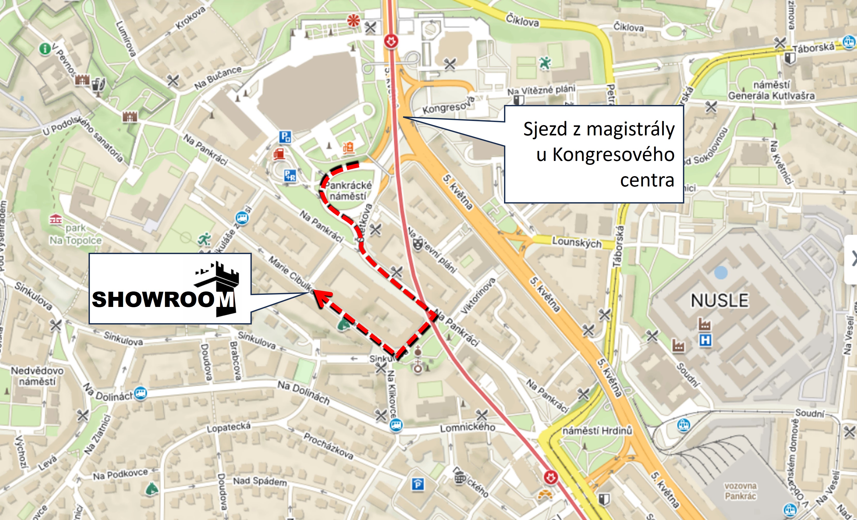 (přibližně uprostřed mezi stanicemi Metra "C" Vyšehrad a Pražského povstání).
